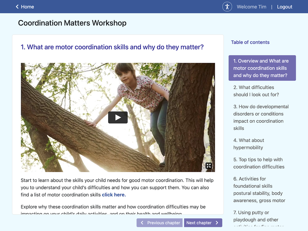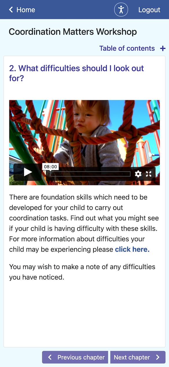 - AJAX-based paging. Previously, a topic would show multiple chapters, each containing a video, repeated in a list down the page. This was replaced with a Javascript-driven approach, where only one chapter is shown at a time, and paging performed by AJAX. This allowed me to increase the canvas size of the video to full column width, and optimise layout of other elements for the viewing of a chapter